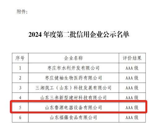 8月6日,《棗莊之窗》從棗莊市企業(yè)聯合會發(fā)布“關于公布2024年度第二批信用企業(yè)名單的通知”獲悉,山東魯源電器設備有限公司等6家企業(yè)獲得AAA級信用等級評價,并予以公布。
